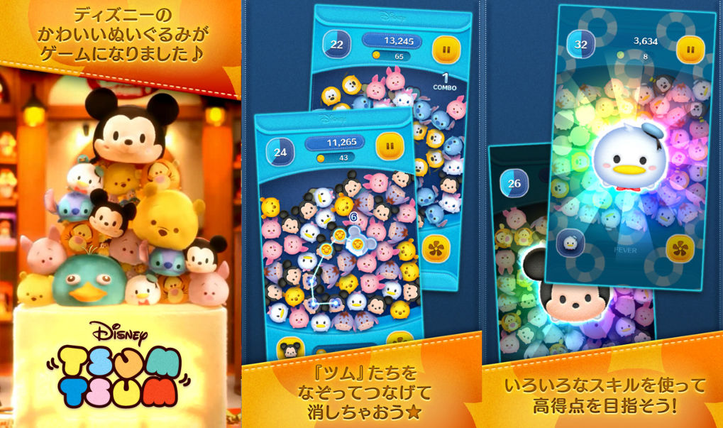 ประเภท : Puzzle หนึ่งในเกมซีรีย์ Tsum Tsum ที่เปลี่ยนเหล่าตัวละครจาก Disney เรื่องต่างๆ ให้กลายเป็นตุ๊กตาตัวกลม ดุ๊กดิ๊กๆน่ารัก โดยรูปแบบการเล่นของแต่ละเกมจะไม่แตกต่างกันมากนัก นั่นก็คือการลากนิ้วเพื่อเชื่อมเหล่าลูกบอลให้หายไปแล้วเราจะได้รับคะแนนกลับมา ซึ่งเกมในซีรีย์นี้ได้รับความนิยมมากในญี่ปุ่น โดยนอกเหนือจากเกมแล้วทาง Disney ยังผลิตออกมาเป็นตุ๊กตาจริงๆอีกด้วย