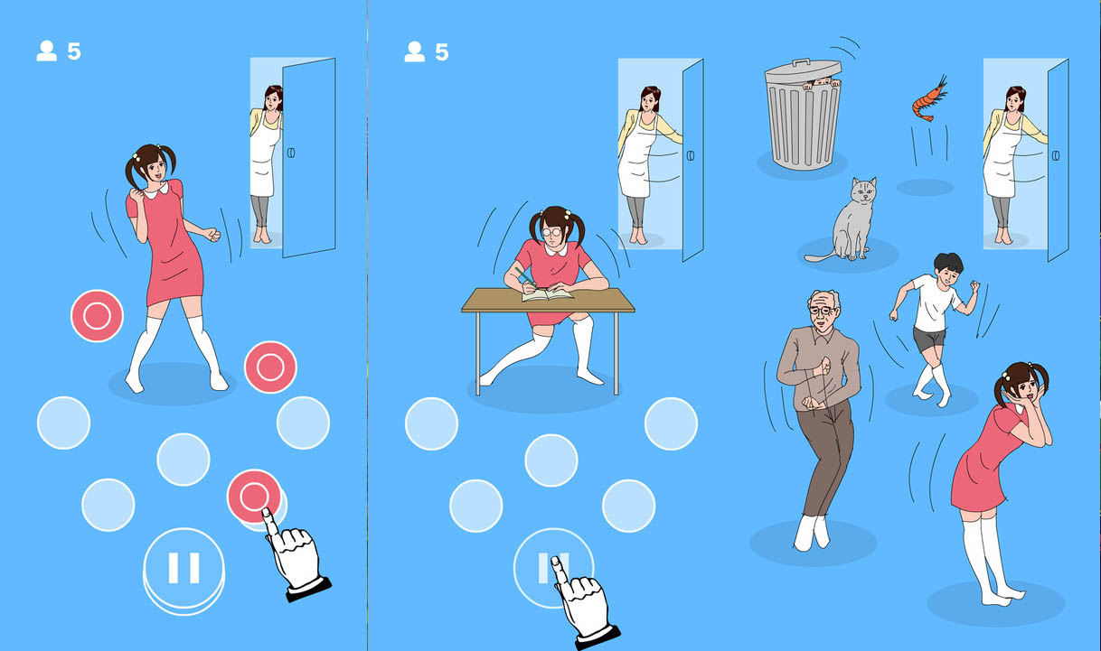 เกมดนครีที่มีคอนเซ็ปของเกมค่อนข้างน่ารักเลยทีเดียว นอกเหนือจากการกดปุ่มตามจังหวะไปเรื่อยๆแล้ว เราจะต้องระวังคนที่บ้านเข้ามาเห็น โดยเราจะต้องรับบทเป็นตัวละครต่างๆ ไม่ว่าจะเป็นนักเรียนมัธยมสาววัยกระเตาะ คุณปู่วัยใกล้ลงโลง และอื่นๆอีกมากมาย เกมนี้เล่นไม่ยากแต่เรียกเสียงหัวเราะและรอยยิ้มจากคุณได้แน่ๆครับ เพราะว่าแต่ละตัวละครนั้นก็จะมีวิธีการแอบและหลบไม่เหมือนกัน