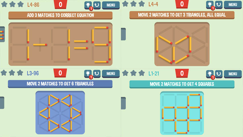 เกม Puzzle เรียงไม้ขีดไฟที่จะให้คุณได้บริหารสมองกับปริศนาหลากหลายภายในเกม ซึ่งส่วนมากแล้วจะเป็นการขยับ หรือเรียงไม้ขีดไฟในจำนวนที่กำหนด ให้ได้คำตอบตามที่โจทย์ต้องการ ถึงแม้ว่าตัวเกมจะดูง่าย แต่ Stage หลังๆของตัวเกมนี้ก็คิดกันจนปวดสมองเหมือนกนนะครับ
