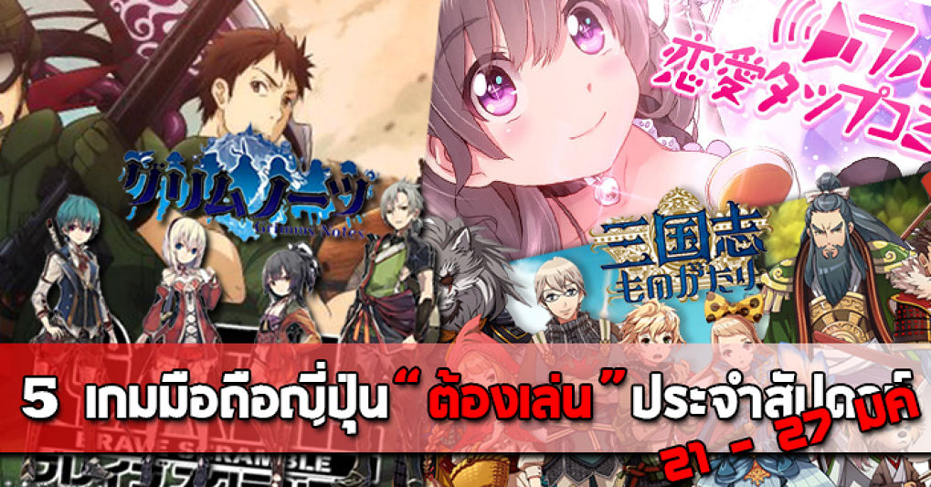 สัปดาห์นี้ถือเป็นสัปดาห์ที่เลิศที่สุดของต้นปีนี้เลยก็ว่าได้ เพราะเกมดัง ๆ มากมายออกมาให้เราได้เล่นกันจนไม่หวาดไม่ไหว ทั้ง Sangokushi Monogatari, GATE Brave Scramble, Weekly My Maid, Grimm Notes และ Under Story ล้วนเป็นเกมชั้นแนวหน้าที่ใครเห็นก็ต้องอยากเล่นกันอย่างแน่นอน ดังนั้น " 5 เกมมือถือญี่ปุ่นต้องเล่นประจำสัปดาห์ " ในครั้งนี้ เราจะมาแนะนำเกมเหล่านี้กันว่าเกมไหนมันโดนใจเพื่อน ๆ บ้าง !!