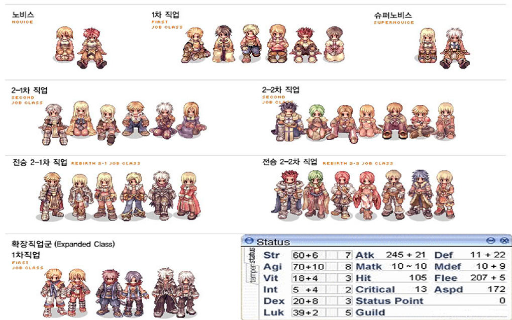 เบื่อมั้ยครับกับเกมสมัยใหม่ที่เราสร้างตัวละครมาตัวหนึ่ง แต่แนวทางการอัพสกิลนั้นก็เหมือนกันไปหมด แต่เกม Ragnarok ไม่ใช่แบบนั้นแน่นอนครับ โดยตอนแรกเราจะได้เป็น Novice ผู้อ่อนแอคนหนึ่ง และพอเราเก็บเลเวลไปเรื่อยๆ Job ถึงเลเวล 10 เมื่อไรเราก็จะสามารถเปลี่ยนอาชีพได้ ซึ่งตัวเกมนั้นจะสามารถให้เราเลือกอาชีพแรกเริ่มได้ถึง 7 สายอาชีพด้วยกันอย่างเช่น Swordman, Acher. Acolyte, Mage, merchant, Theft และ Super Novice (แต่ Super Novice ต้องมีเงื่อนไขเลเวล 45 ถึงจะสามารถเปลี่ยนอาชีพได้และจะเปลี่ยนคลาสต่อไปไม่ได้) และพอเราเล่นไปจนค่า Job ถึง 40 หรือ 50 เมื่อไร เราก็สามารถเลือกที่จะเปลี่ยนอาชีพได้อีกสองสายอาชีพด้วยกันแล้วแต่ที่เราจะชอบ ( แต่แพทแรกอาจจะยังมีเพียงแค่อาชีพเดียว ) และพอเราเปลี่ยนอาชีพแล้วนั้น ตัวสกิลของแต่ละอาชีพก็จะแบ่งกันไปอีกหลายสายอีกด้วยอย่างเช่นเราเล่นอาชีพนักดาบ ตัวสกิลที่ให้อัพเขาก็จะให้เราเลือกว่าจะเล่นสายดาบสองมือ, ดาบมือเดียวหรือจะเป็นสายหอกก็ได้เป็นต้น และค่า Status ของเราก็สามารถอัพได้อย่างตามใจอีกด้วย ซึ่งค่า Status นั้นจะมีอยู่ 6 แบบก็คือ Str, Agi, Int, Vit, Dex, Lux ซึ่งแต่ละค่าก็จะมีความได้เปรียบเสียเปรียบที่แตกต่างกันไป โดยถ้าเราเน้นอัพ Str-Agi-Dex เราก็จะโจมตีแรงและรวดเร็วแต่แลกกับการที่เรานั้นอาจจะเลือดน้อยอะไรแบบนี้ ซึ่งเราสามารถอัพสเตตัสตามสไตล์ของเราได้อีกด้วย