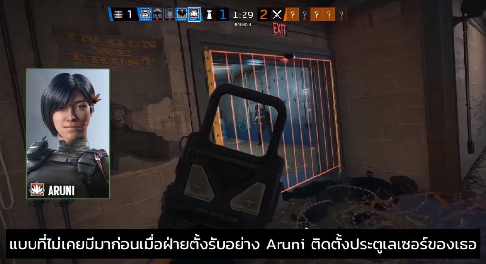 - ตัวละคร ARUNI เป็นฝ่ายป้องกัน (Defender) โดยมีอุปกรณ์คือกับดักในชื่อ "Surya Gate" (ภาษาไทยจะอ่านได้ประมาณว่าประตูสุริยะ) ที่สามารถสร้างประตูเลเซอร์ขึ้นมาได้อย่างอิสระ ไม่ว่าจะเป็นตรงประตูห้อง, หน้าต่าง และกำแพง หรือเพดานในจุดที่สามารถทำลายได้