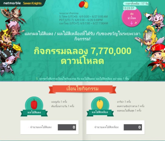 ยิ่งไปกว่านั้นการอัพเดทครั้งนี้ กำลังจะมีอีเวนท์ "เฉลิมฉลองจำนวนดาวน์โหลด 7.77 ล้านดาวน์โหลด" ซึ่งผู้เล่นจะได้รับ รูบี้ในเกมเซเว่นไนท์ จำนวน 250 รูบี้ ฟรีๆไปเลย เพียงแค่เข้าเกมและสะสมผลไม้ไว้ อีกทั้งยังมีเครื่องประดับ 6 ดาว สำหรับผู้เล่นที่เล่นเกมอย่างต่อเนื่องอีกด้วย !! โหยคือดีย์ของฟรีรัวๆ วิธีทำก็ตามนี้เลย