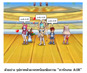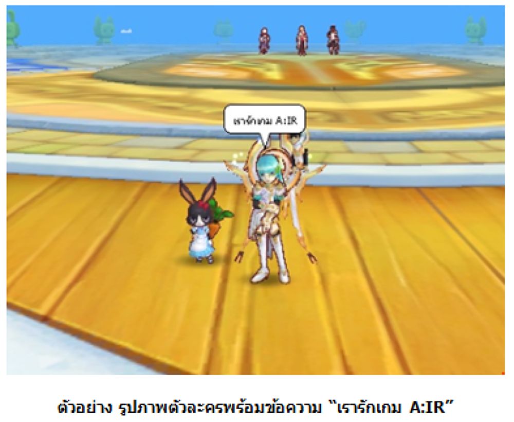 2. Show Your Character ลงทะเบียนพร้อมรูปตัวละคร เพียงแค่ลงทะเบียนพร้อม Upload รูปตัวละครจากเกมใดก็ได้ที่เพื่อนๆ เล่น โดยมีเงื่อนไขว่าตัวละครจะต้องพิมพ์ข้อความในเกมว่า ‘‘เรารักเกม A:IR’’ รับ 1 IC พร้อมไอเทมพิเศษในเกม รายละเอียดเพิ่มเติม