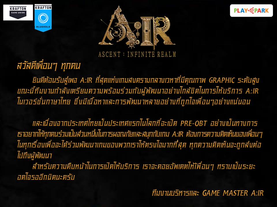 โดยเพจได้โพสท์ข้อความต้อนรับผู้เล่นชาวไทยทุกท่านว่าขณะนี้กำลังเตรียมความพร้อมร่วมกับผู้พัฒนาอย่างใกล้ชิดในการให้บริการในเวอร์ชั่นภาษาไทย โดยมีเนื้อหาและการพัฒนาหลายอย่างที่จะถูกใจผู้เล่นชาวไทยอย่างแน่นอน และประเทศไทยจะเป็นประเทศแรกในโลกที่จะเปิด PRE-OBT อย่างเป็นทางการอีกด้วย เรียกได้ว่าพิเศษสุดๆสำหรับแฟนๆชาวไทยเลยทีเดียวสำหรับ A:IR Ascent: Infinite Realm เป็นเกมออนไลน์แนว MMORPG จากทีมผู้พัฒนา TERA ที่ถูกเซ็ตธีมไว้ที่โลกและบรรยากาศแนว Steampunk ที่จะผสมผสานโลกของจักรกลและเวทย์มนต์เอาไว้ด้วยกันอย่างลงตัว ผู้เล่นจะสามารถเลือกใช้ยานพาหนะเพื่อไปบินไปบนท้องฟ้า และใช้มันทำการต่อสู้ได้อีกด้วย และเจ้ายานพาหนะนี่แหละเป็นอีกหนึ่งระบบสำคัญที่จะใช้ในการเล่นโหมด Realm VS Realm หรือพูดง่ายๆก็คือ PVP ที่จะให้ผู้เล่นบังคับยานของตัวเองไปสู้รบกับคนอื่นบนสมรภูมิกลางเวหา และบนพื้นดินยังมีทั้งหุ่นยนต์ และปืนใหญ่ให้เลือกใช้อีกด้วย แฟนๆชาวไทยก็อดใจรอกันอีกนิด ได้เล่นกันในปี 2019 นี้แน่นอนครับ!