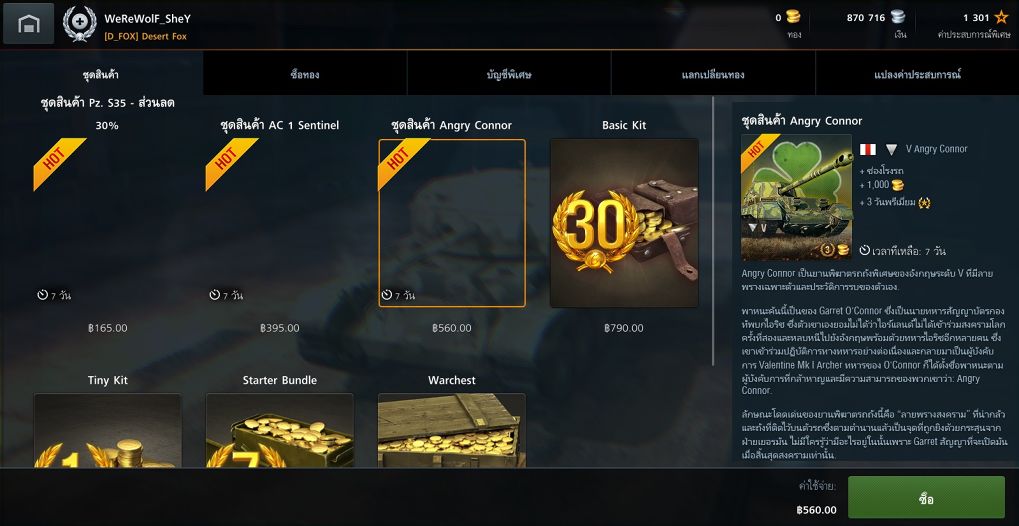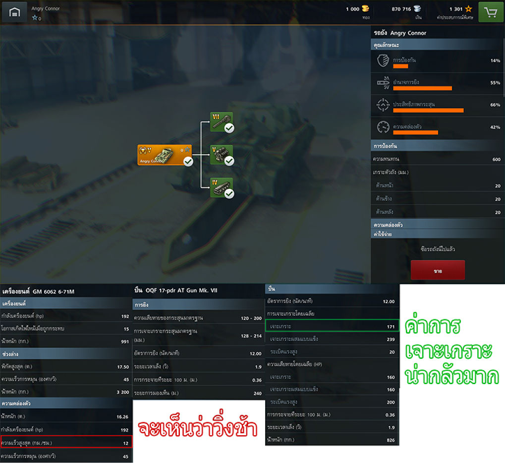 รถถังพรีเมียม Angry Connor มาพร้อมกับชุด Bundle ซึ่งจะมีรถถัง Angry Connor หนึ่งคัน โรงรถหนึ่งช่อง บัญชีพรีเมียมสามวัน ทองจำนวนหนึ่งพัน รวมถึงมีการเขียนอธิบายประวัติที่มาของชื่อรถถัง Angry Connor ไว้อย่างคร่าว ๆ ตามภาพเลยครับ แต่ผมขอเสริมเป็นเกร็ดความรู้นิดหนึ่งว่า เจ้ารถถังคันนี้เนี่ย ถูกดัดแปลงมาจากตัวรถถังที่ชื่อ Valentine และได้ทำการถอดป้อมปืนออก แทนที่ด้วยปืนใหญ่ขนาด 17 ปอนด์เข้าไป แต่ความพิศดารของมันคือ เป็นการติดตั้งปืนจากด้านหลังรถ...ใช่ครับ อ่านไม่ผิดหรอก ติดจากหลังรถ เอาก้นหันใส่หน้าศัตรูพร้อมกับปืนนั้นแหละ มีจุดประสงค์หลัก ๆ คือ เมื่อยิงใส่รถถังข้าศึกก็สามารถเผ่นกันป่าราบได้อย่างรวดเร็ว ถือเป็นความฉลาดของวิศวกรรถถังยุคนั้นเลยก็ว่าได้ครับ