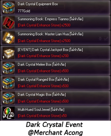 โดยเหล่านักรบที่มีเลเวล 60 ขึ้นไปนี้จะต้องมีกล่องอาวุธ Dark Crystal Equipment เสียก่อน แล้วจึงออกตามล่ามอนสเตอร์ Dark Invader ที่ปรากฎตามแผนที่ต่าง ๆ เพื่อล่า Dark Crystal Enhance Stone ซึ่งสามารถนำไปตีบวก เสริมความแข็งแกร่ง และยังนำไปแลกไอเทมได้ที่ Merchant Acong ได้อีกด้วย