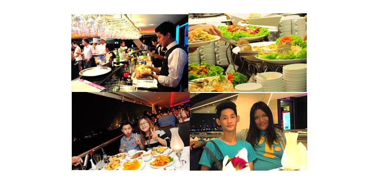 เมื่อเรือเทียบท่า ได้เวลาขึ้นเรือไปทานอาหารมื้อค่ำกันซึ่งทั้งสองคู่เลือกโต๊ะนั่งบริเวณท้ายเรือที่ค่อนข้างเป็นส่วนตัวเพื่อจะได้เต็มอิ่มกับบรรยากาศกรุงเทพยามค่ำคืน และอาหารก็บนเรือก็เตรียมพร้อมเสิร์ฟให้ทุกคนได้เลือกทานกันอย่างเต็มอิ่มและหลากหลายกว่า 30 ชนิด ทั้งอาหารไทย คาว-หวาน และ อาหารอินเตอร์เนชั่ลแนลพร้อมทั้งเค้กและเบเกอรี่ที่แสนอร่อยอีกด้วย