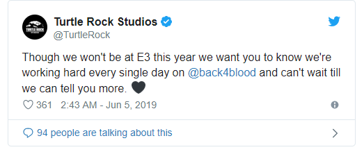 Turtle Rock Studios ได้ทวิตลงบนทวิตเตอร์ว่า พวกเขาจะไม่มางาน E3 2019 แต่อยากบอกให้แฟนๆ รู้ว่า ตัวเกม Back 4 Blood นั้นกำลังพัฒนาอย่างหนักอยู่ทุกวัน และทางทีมงานก็รอคอยไม่ไหวที่อยากจะบอกข้อมูลเพิ่มเติม สำหรับโปรเจ็กต์ Back 4 Blood ผลงานเกม FPS ซอมบี้ตัวใหม่นั้นได้เริ่มต้นประกาศและพัฒนามาในช่วงต้นปี 2019 โดยตัวเกมนั้นได้ร่วมมือกันกับทาง Warner Bros. Games ซึ่งเกมนี้หลังจากประกาศไปก็มีเสียงลือเสียงเล่าอ้างว่า เกมนี้คือภาคต่อของ Left 4 Dead บ้างล่ะ หรือมันคือการสร้างใหม่เพื่อทับรอยผลงานสุดฮิตของตัวเองบ้างล่ะ และ Turtle Studio ก็สยบข่าวลืออย่างชัดเจนว่า "เขานั้นจะไม่หยิบเอาไอเดียเก่าๆ ของเกม Left 4 Dead มาใช้ในเกมนี้อย่างแน่นอน และพยายามจะใช้สิ่งใหม่ๆ เพื่อทำให้เกมนี้เติบโตไปพร้อมๆกัน" แต่ทั้งนี้ทั้งนั้นก็ยังยืนยันได้ยากว่าเกมนี้ สรุปคือชื่อภาคต่อ Left 4 Dead 3 หรือไม่? แต่สิ่งที่ยืนยันได้อย่างชัดเจนคือ แฟนๆ เกมนี้ต่างเฝ้าหวังและรอคอยข้อมูลต่างๆ ของเกมนี้อย่างแน่นอน