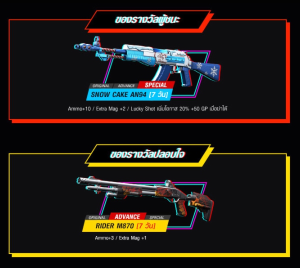 ► ของรางวัลสำหรับผู้ร่วมกิจกรรม Mini match ในงาน Extreme games 2018 ผู้ชนะจะได้รับ Snow Cake AN94 [7วัน] ผู้แพ้จะได้รับ Rider M870[7วัน]