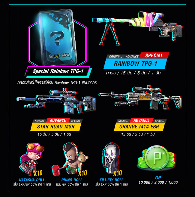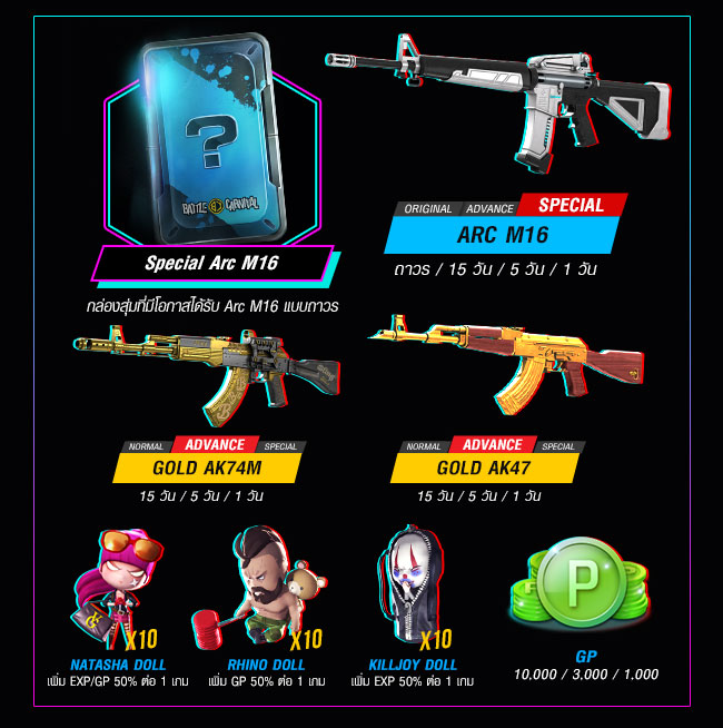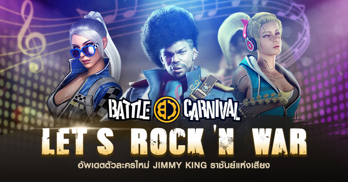ถึงเวลาระเบิดสนามรบให้กระจุยไปกับ Battle Carnival จากค่าย Electronics Extreme ที่สุดแห่งวงการเกม FPS ประกาศอัพเดทช์ความสนุกอีกขั้นปลดล็อคอาวุธมากมายแบบจุใจอาทิเช่นปืน Gold Ak74M(Advance), Special Arc M16 (Gachapon Pack), Special Rainbow TPG-1 (Gachapon Pack) พร้อมทั้งสกินใหม่ Star Racing Natasha, แผนที่ Radar Team Deathmatch เพื่อเป็นการต้อนรับการมาอย่างยิ่งใหญ่ของ Jimmy King ราชันย์แห่งเสียงดนตรีหากพร้อมแล้วสามารถ Let’s Rock ‘N War กันได้แล้วตั้งแต่วันนี้! Character