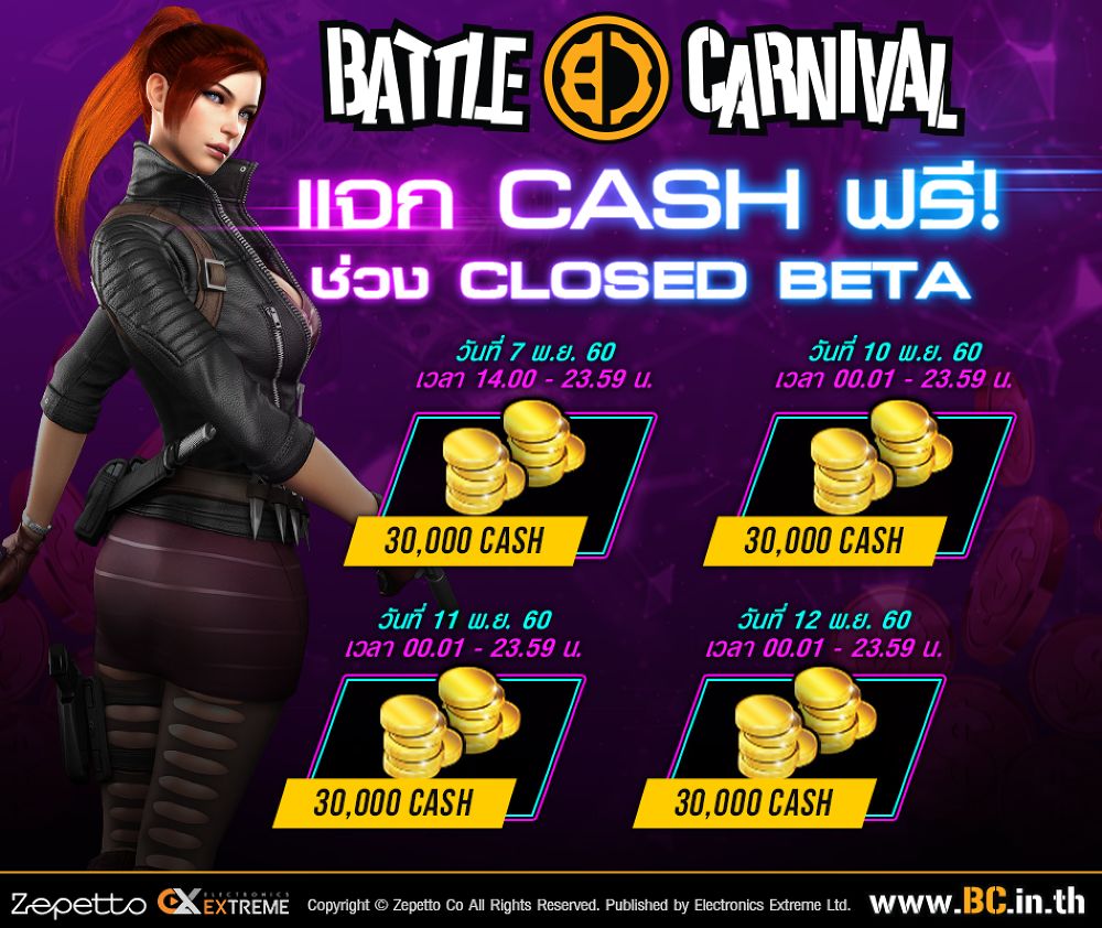 - ผู้เล่นสามารถกดรับ Cash ได้ในวันที่ 7,10,11 และ 12 พ.ย. 60 ได้ทางหน้าเว็บไซต์ >> https://exe.in.th/bc-activities