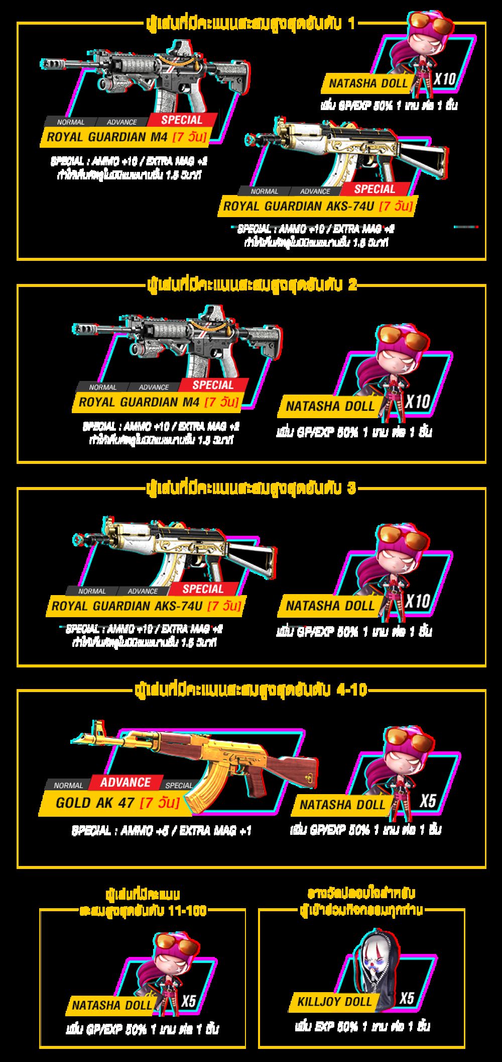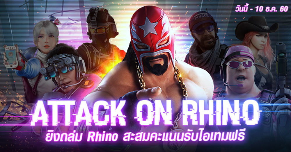 งานนี้ต้องขอแรงทุกคนช่วยปกป้องฐานทัพและกำจัดเจ้า Rhino จอมบ้าคลั่งเพื่อสะสมคะแนนแลกของรางวัลสุดพรีเมี่ยมมากมาย อย่าง ปืน Royal Guardian M4 (7วัน) , Royal Guardian AKS-74U (7วัน) ไปเลยฟรีๆงานนี้สนุกแน่นอนอย่ารอช้า มาร่วมกันสั่งสอนเจ้า Rhino ให้รู้สำนึกว่าแถวนี้เป็นที่ของใคร! กันได้ตั้งแต่วันนี้ -10 ธันวาคม 2560
