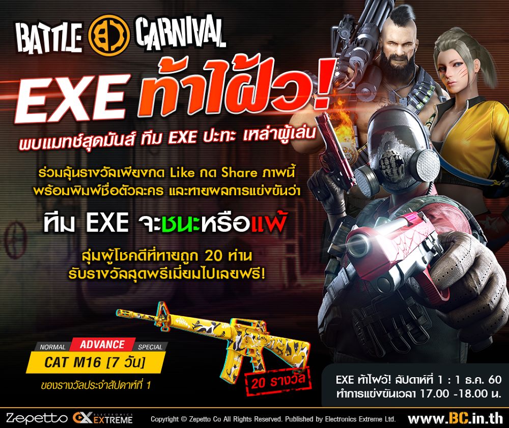 นอกเหนือไปกว่านั้น Battle carnival ยังปล่อยกิจกรรมให้ร่วมสนุกระหว่าง Gmหัวร้อน Vs เหล่าผู้เล่นสุดแน่ ที่ตลอดเดือนธันวาคมนี้ ร่วมสนุกง่ายๆ เพียงแค่ทายผลการแข่งขันระหว่างทีม EXE กับผู้เล่นอื่นว่า ทีมของ EXE จะชนะหรือแพ้ หากทายถูกก็ลุ้นรับไอเทมไปใช้ฟรี อาทิเช่น ปืนCat M16 ,สกินMountain Guard Rumble Jack นาน 7วัน อีกด้วย