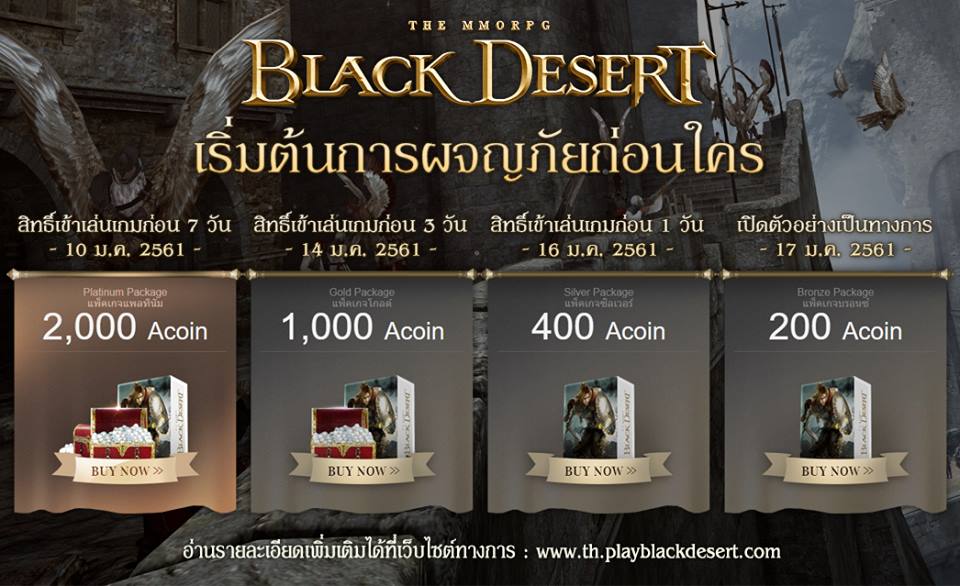 ซึ่งก็มีเพื่อนๆ บางคนที่ยังไม่ทราบว่าตัวเกม Black Desert จะต้องซื้อแพ็คเกจก่อนถึงจะสามารถเล่นเกมนี้ได้ โดยมีการแบ่งแพ็คเกจออกไปทั้งหมด 4 ชุดด้วยกัน สนนราคาเริ่มต้นอยู่ที่ 200 บาทเท่านั้น โดยแต่ละแพ็คเกจผู้เล่นจะได้รับไอเท็มที่ช่วยอำนวยความสะดวกแก่ผู้เล่นมากขึ้น ส่วนรายละเอียดอื่นๆ มีดังต่อไปนี้ค่ะ