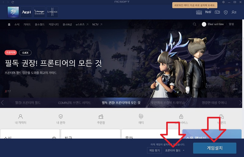 3. พอติดตั้ง NC Launcher 2 เรียบร้อยแล้ว จากนั้นให้ล็อคอินเข้าระบบ → เลือกเกม Blade & Soul → กดปุ่มมุมขวาล่างลูกศร เพื่อเข้าสู่เซิร์ฟเวอร์เกาหลี [KR] ที่มีชื่อว่า "Frontier World - 프론티어 월드" → กดคลิ๊กปุ่ม "게임설지" แล้วทดสอบเกมกันได้ล่ะ