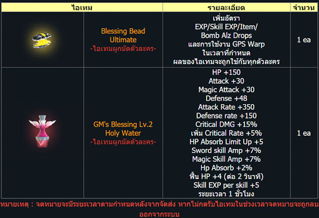 เมื่อถึงระยะเวลากิจกรรมทีมงานจะทำการส่งไอเทม Blessing Bead - Ultimate และ GM's Blessing (Lv.2) Holy Water เข้าไปยังระบบจดหมายของผู้เล่น