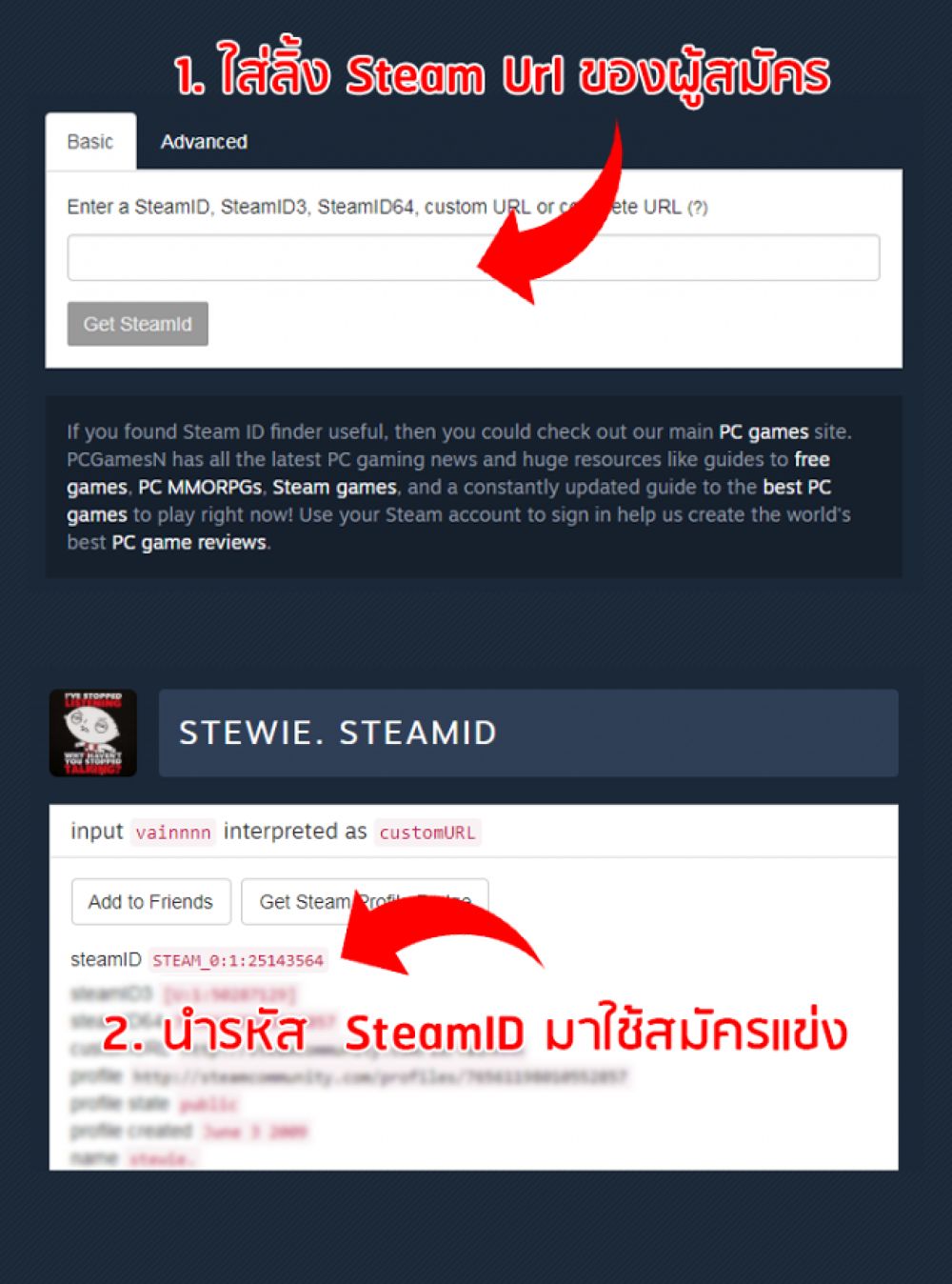 - รายละเอียดในการสมัคร จะต้องกรอก ชื่อทีม (ตรงกับทีม Team Tag) , Steam ID หรือ Steam URL , IGN (ชื่อในเกม) , ชื่อ-นามสกุล และเบอร์ติดต่อ , FACEBOOK URL ถ้าทีมงานไม่สามารถเช็คอย่างใดอย่างนึงได้จะถือว่า จงใจใช้ข้อมูลปลอมเพื่อการแข่งขัน มีสิทธิ์แบนออกจากการแข่งขันได้
