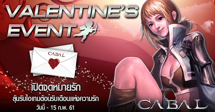 ไปดูกันที่กิจกรรมแรกกันก่อน เพื่อเป็นการต้องรับวันแห่งความรัก Cabal จึงจัดกิจกรรม Valentine's Event : เปิดจดหมายรักลุ้นรับไอเทม เพียงออกล่าเหล่ามอนสเตอร์ค้นหาจดหมายรัก Love Letter ที่ถูกช่วงชิงไป เพื่อเปิดหาช่อดอกไม้ Red Rose และ White Rose พร้อมเงิน 100,000 Alz ลุ้นรับไอเทมจากกล่องสุ่ม Fortune Cookie กันได้แล้วที่ NPC Yul