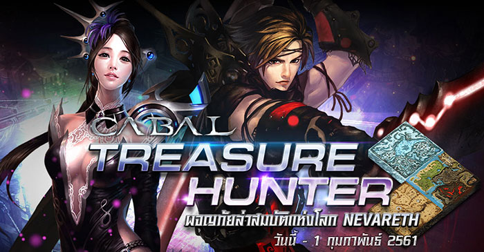 ร่วมฝ่าฟันล่าสมบัติแห่งโลก Nevareth ง่ายๆ เพียงแค่เข้าเล่นเกม Cabal เป็นเวลา 1 ชั่วโมง ก็สามารถได้รับสิทธิ์ในการเล่นกิจกรรม Treasure Hunter โดยผู้เล่นสามารถสะสมได้ 5 สิทธิ์ต่อวัน ภายในกิจกรรมมีของรางวัลดีๆ มากมาย ให้ได้ลุ้นรับกัน เริ่มกิจกรรมวันที่ 15 มกราคม 2561 (เวลา 18.00 น.) และสิ้นสุดกิจกรรมวันที่ 1 กุมภาพันธ์ 2561 (ก่อนปิดปรับปรุงเซิร์ฟเวอร์ประจำสัปดาห์) จะมัวรอช้าอะไรอีกออกไปผจญภัยกันเถอะ!!