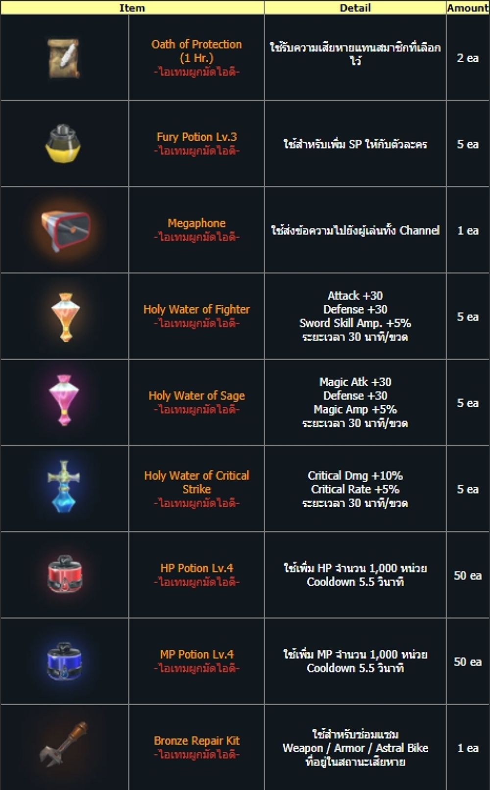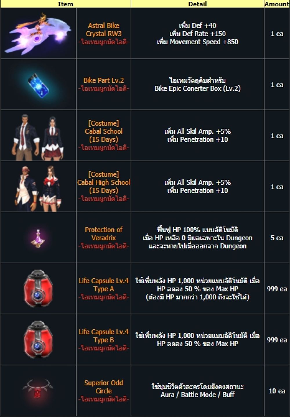 (เมื่อผู้เล่นเดินทางไปถึงแผนที่ Bonus Box จะมีโอกาสได้รับไอเทมแรร์แบบสุ่ม 1 ชิ้นตามตารางด้านล่าง)