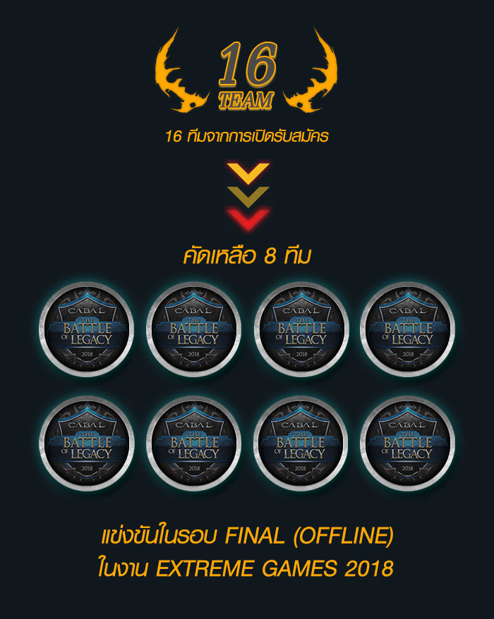 •ผู้สมัครทุกคนที่เข้ารอบ 8 ทีมสุดท้ายจะต้องสามารถไปแข่งขันรอบ Offline ในงาน Extreme Games 2018 ในวันที่ 24-25 มีนาคม 2561 ณ ห้องไอส์แลนด์ ฮอลล์ ชั้น 3 ศูนย์การค้าแฟชั่นไอส์แลนด์ได้