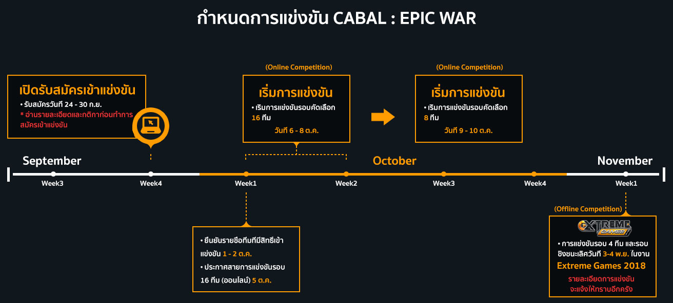 - เริ่มการแข่งขันรอบ 4 ทีม (Offline Competition) วันที่ 3 - 4 พฤศจิกายน 2561 ในงาน Extreme Games 2018 ณ MCC Hall The Mall งามวงศ์วาน สำหรับรายละเอียดการแข่งขันจะแจ้งให้ทราบอีกครั้ง