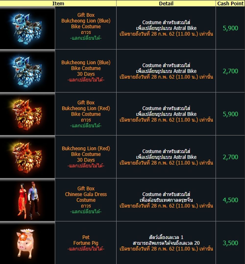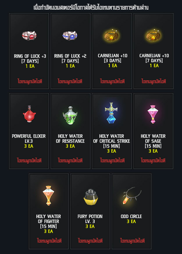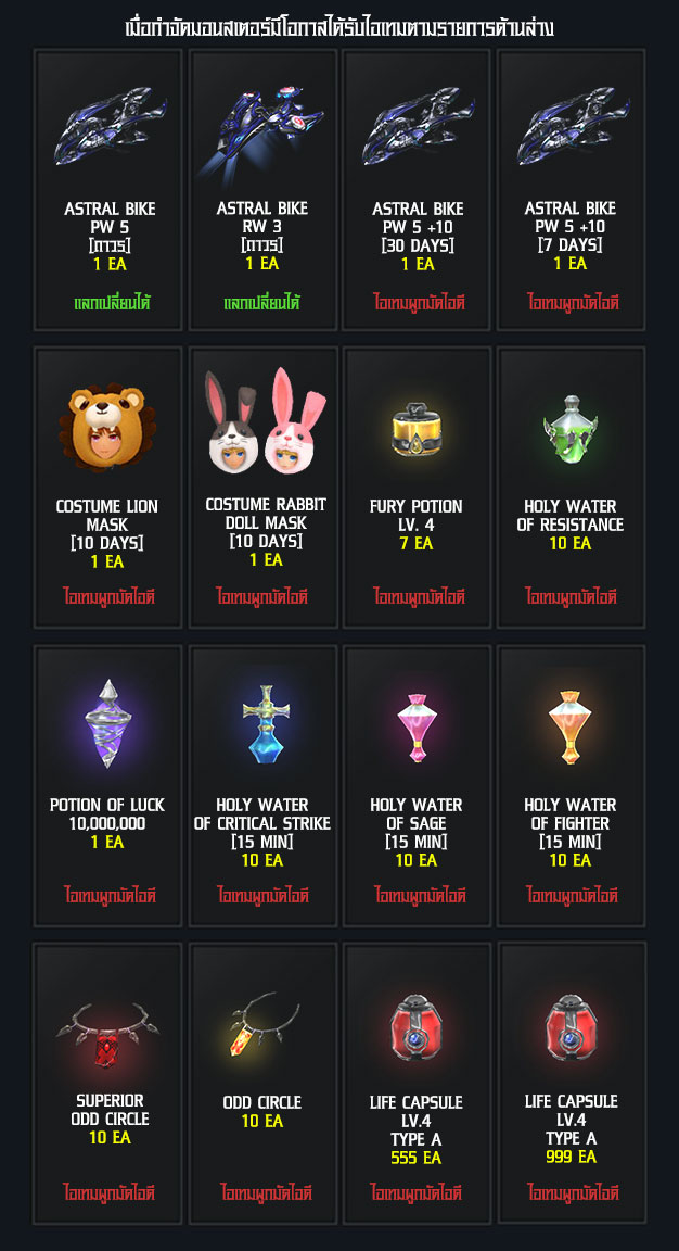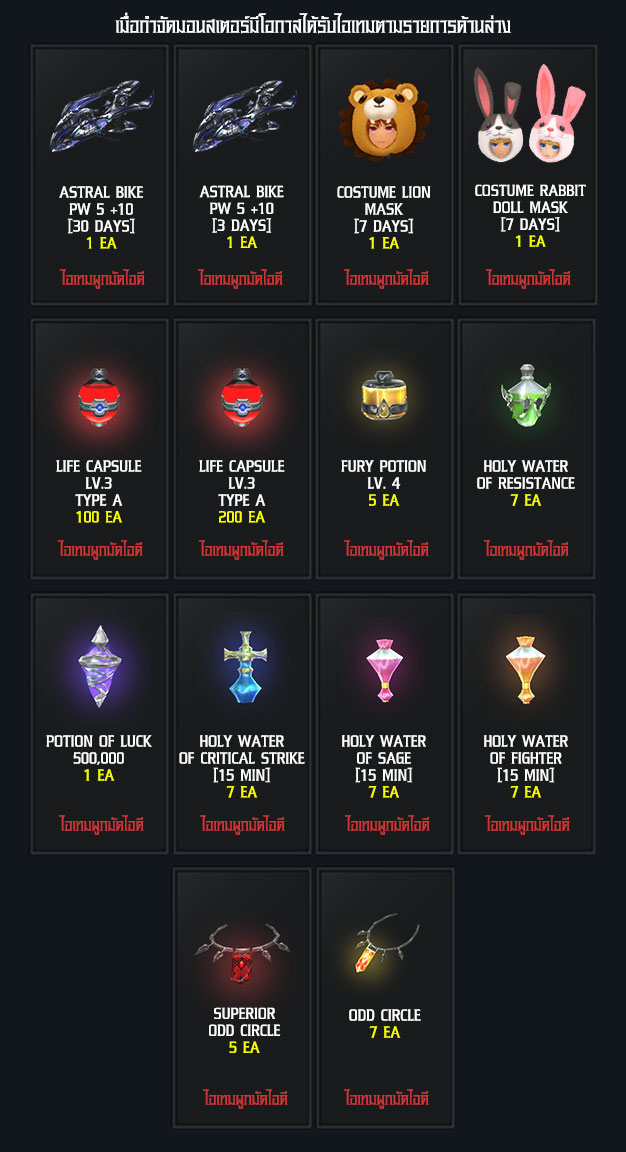 - โดยไอเทมที่ตกจาก Dancing Lion ไม่จำกัดการทำดาเมจสูงสุดในการเก็บไอเทม (สามารถเก็บได้ทุกคน)
