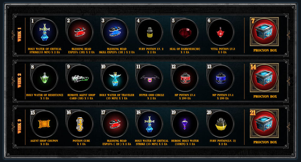 - เมื่อล็อกอินครบ 7 วัน, 14 วัน และ 21 วัน แล้วกด share ผ่าน Facebook จะได้สิทธิ์สุ่มไอเท็ม 1 อย่าง โดยหน้าเว็บจะสุ่มไอเท็มภายในกล่อง Procyon Box และจัดส่งไอเทมเข้าสู่ cash Inventory