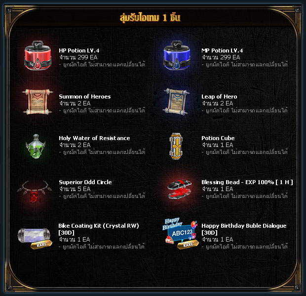 - ผู้เล่นจะต้องมีตัวละครภายในไอดีดังกล่าว อย่างน้อย 1 ตัว จึงจะรับไอเทมจากกิจกรรมได้