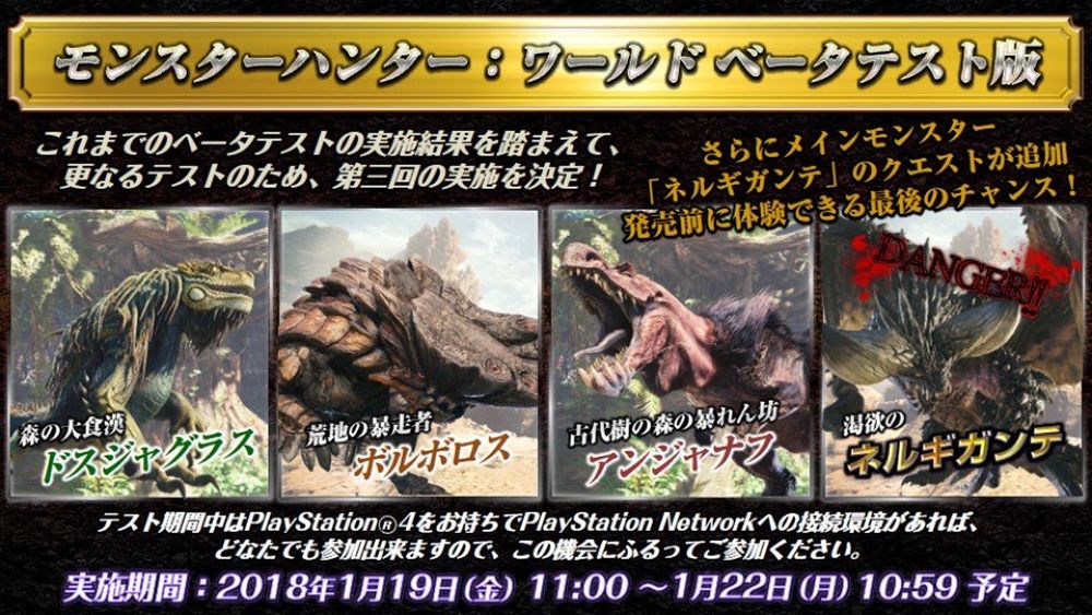 และดูเหมือนจะเซอร์ไพรส์เกมเมอร์ต่อเนื่องด้วยการประกาศเปิดทดสอบตัวเกม Monster Hunter: World ในช่วง Final Beta ( รอบที่ 3 แล้วนะที่เทสในตอนนี้ ) โดยจะเริ่มการทดสอบในวันที่ 19 มกราคมนี้ตั้งแต่เวลา 09.00 น.ตามเวลาในประเทศไทย แล้วจะไปสิ้นสุดในวันที่ 22 มกราคมเวลา 08.59 น.ตามเวลาในประเทศไทย ซึ่งการทดสอบในรอบนี้ก็ยังคงเป็นภารกิจให้ล่ามอนสเตอร์ 3 ตัวเหมือนเดิมได้แก่ Great Jagras, Barroth และ Anjanath รวมไปถึงยังมีการสุ่มเจอมอนสเตอร์อีก 2 ตัวได้แก่ Pukei Pukei และ Kululu Yaku ที่พิเศษสุดก็คือมีภารกิจพิเศษที่จะให้เราจะต้องไปล่า "Nergigante" ในระยะเวลาเพียงแค่ 15 นาที!!!