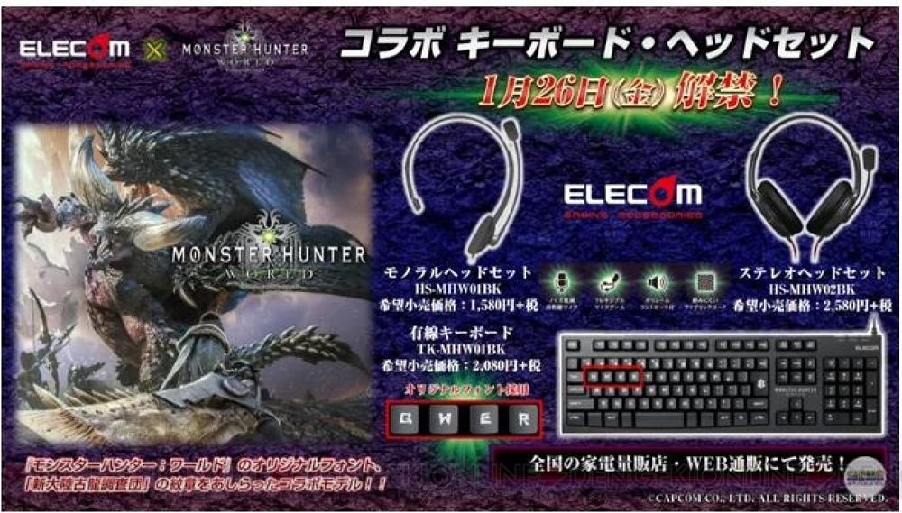 ยังไม่หมดแค่นั้นนะครัช Monster Hunter: World ยังได้จับมือกับค่ายเกมมิ่งเกียร์มีชื่อของประเทศญี่ปุ่นอย่าง "Elecom" โดยภายในชุดจะประกอบไปด้วยคีย์บอร์ดและหูฟัง 2 แบบให้เกมเมอร์ได้เลือกซื้อกัน และ ยังจับมือกับ "Alook" แบรนด์แว่นตาชั้นนำของประเทศญี่ปุ่นออกแว่นตาตัวใหม่ให้กับเกมเมอร์ด้วย โดยจะวางจำหน่ายภายในปีนี้ ตัวเกม Monster Hunter: World มีกำหนดวางจำหน่ายในวันที่ 26 มกราคมปีหน้าทั้งเวอร์ชั่น PlayStation 4 หรือ Xbox One ส่วนเวอร์ชั่น PC ได้เล่นชัวร์ปลายปีนี้