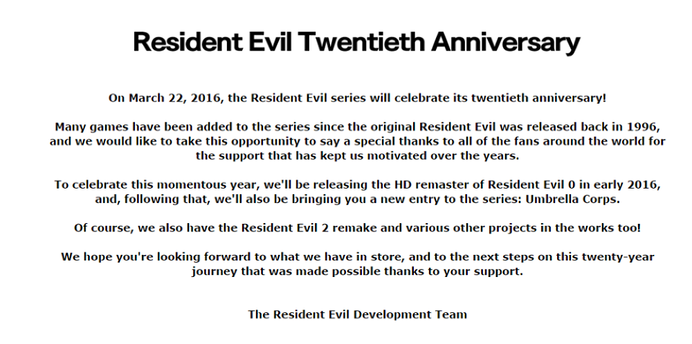 จะมีเซอร์ไพรส์ในวันเดียวกันนี้กันด้วย ก่อนหน้านี้มีข่าวลือเกี่ยวกับ Resident Evil 7, Resident Evil: Outbreak HD Remaster และ Resident Evil เวอร์ชั่นอนิเมะชั่นยาว ก็ต้องมาลุ้นกันว่าเซอร์ไพรส์ที่ค่ายแคปหมูพูดถึงคืออะไรกันแน่!!!