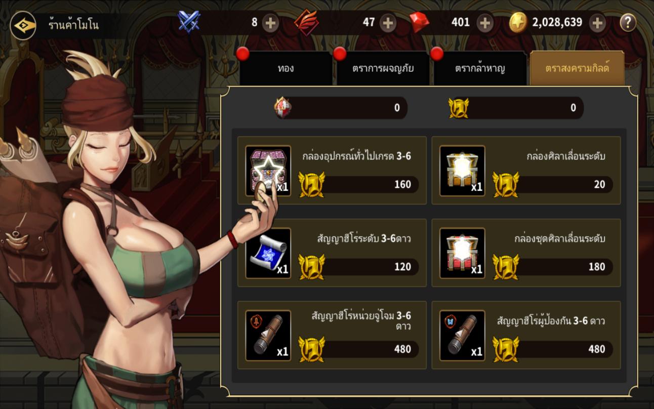 ร้านค้ากิลด์ เป็นร้านของแม่ค้าโมโน ซึ่งสมาชิกกิลด์สามารถนำตราสงครามกิลด์ที่ได้จากการเข้าร่วมสงครามกิลด์ มาใช้ซื้อของในร้านค้ากิลด์นี้ได้ ซึ่งของที่มีให้เลือกซื้อจะแตกต่างจากร้านค้าทั่วไปโดยสิ้นเชิง เช่นตั๋วสุ่มฮีโร่แบบเจาะจงชนิด, กล่องสุ่มอุปกรณ์ระดับต่างๆ เป็นต้น