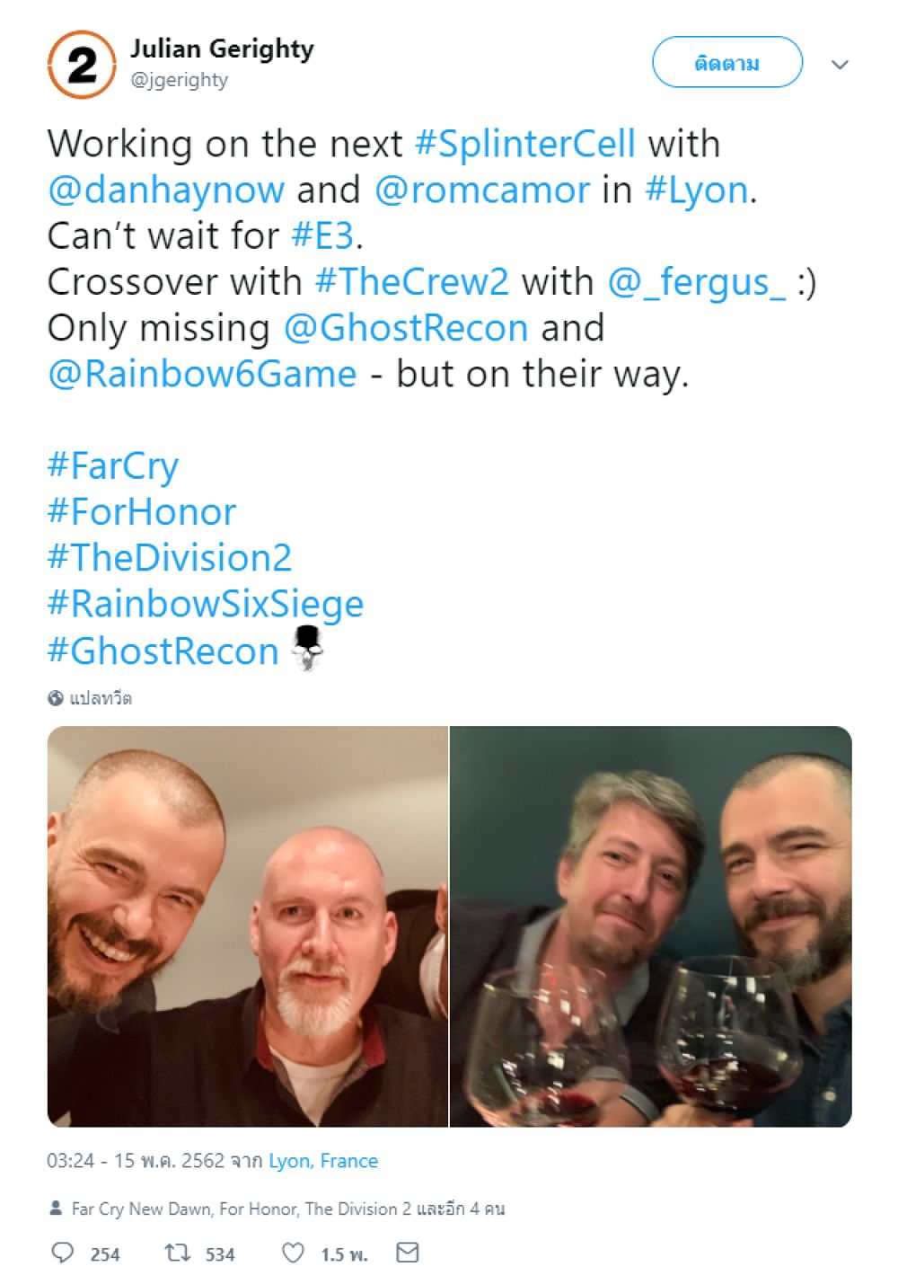 ช่วงนี้ Ubisoft เข็นเกมใหญ่ออกมาเป็นว่าเล่น ตั้งแต่ Tom Clancy's The Division 2, Far Cry: New Dawn และล่าสุดกับ Tom Clancy's Ghost Recon: Pointbreak ที่เรียกเสียงฮือฮาให้กับแฟนเกมสายยุทธวิธีทางทหารเป็นอย่างมาก ล่าสุดคุณ Julian Gerighty Creative Director ของค่าย Ubisoft ก็ได้ทวีตลงในทวิตเตอร์ส่วนตัวว่า เขานั้นกำลังทำ Splinter Cell ภาคใหม่อยู่
