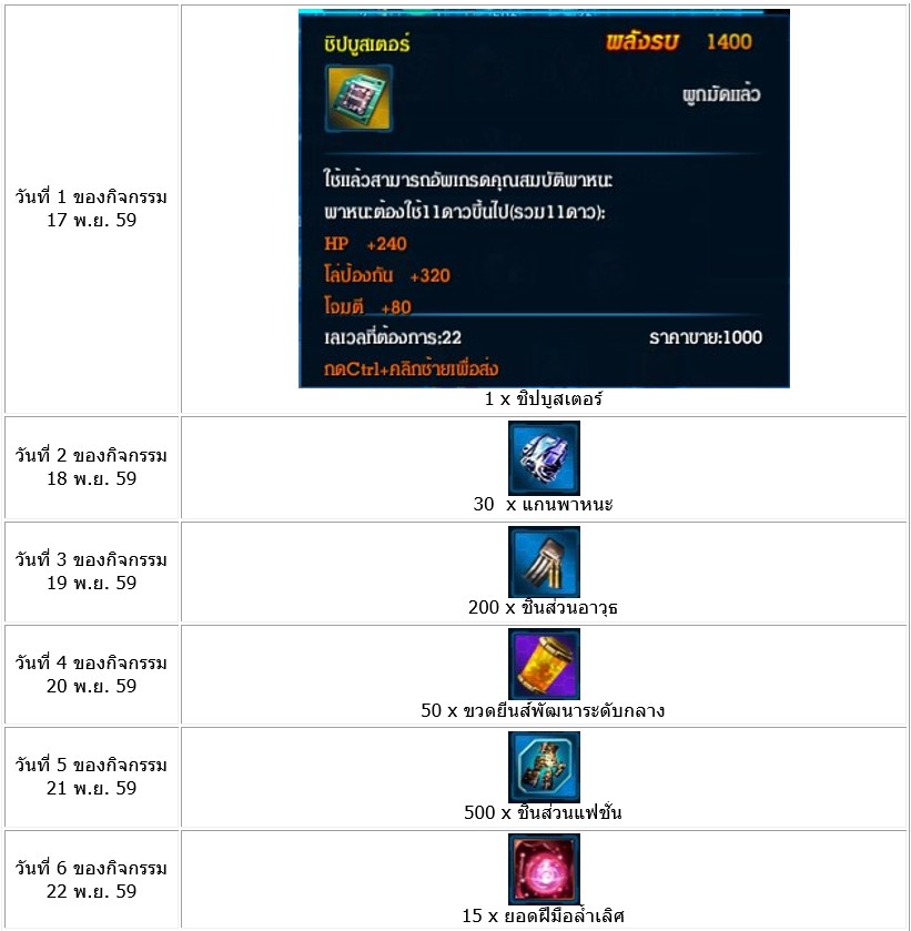 ในช่วงเวลากิจกรรม เมื่อผู้เล่นทำการ Login เข้าเล่นเกมจะได้รับอาวุธตามที่กำหนด โดยรางวัลที่จะได้รับจะเข้าทางระบบจดหมายในเกม และตัวอาวุธเมื่อได้รับแล้วสามารถกดใช้เมื่อใดก็ได้แม้ว่าจะหมดช่วงเวลากิจกรรมแจกแล้วก็ตาม