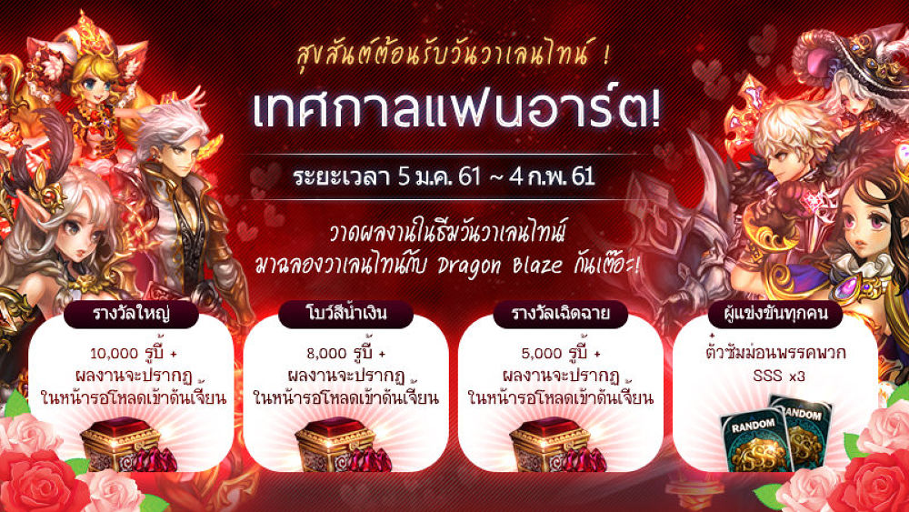 วาเลนไทน์เวียนมาถึงอีกแล้ว ใครโสด ใครไม่โสด ก็ขอเชิญมาวาดรูปแฟนอาร์ตกับกิจกรรม “ความรักอยู่รอบตัวเรา” กิจกรรมใหม่ล่าสุดของเกม Dragon Blaze เพื่อฉลองวันแห่งฟามฮัก! โดยผู้สนใจและรักในการวาดภาพทั้งหลายสามารถส่งผลงานมาได้ตั้งแต่วันที่ 5 ม.ค. - 4 ก.พ. 2018 แล้วรอลุ้นรางวัลสุดพิเศษที่ใครเห็นต้องร้องว้าว แถมผลงานที่ชนะยังจะได้ปรากฏในเกมให้เป็นเกียรติเป็นศรีแก่วงศ์ตระกูลอีกด้วย!