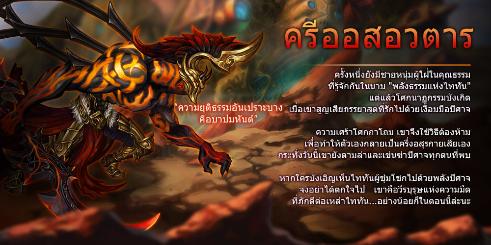 เมื่อความเศร้าโศกกลายร่างเป็นความเคียดแค้น…. ก่อเกิดเป็นครีออสอวตาร ชายหนุ่มผู้สูญเสียภรรยาไปด้วยเงื้อมมือของเหล่าปีศาจ นั่นเป็นสาเหตุที่ครีออสเปลี่ยนตัวเองให้เป็นอสุรกายเพื่อล้างบางเจ้าปีศาจร้ายที่พรากคนรักไปจากเขา