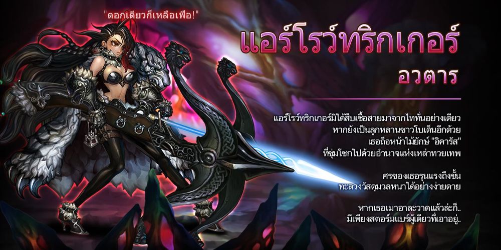 และอีกตัวคือ "แอโรว์ทริกเกอร์" ผู้ถือครองอิคารัส หน้าไม้ขนาดยักษ์ที่เปี่ยมด้วยพลังแห่งเหล่าเทพ สาวสวยผู้ชำนาญการทำลายล้างจากระยะไกล สกิล "ศรทำลายล้าง" และ "ศรสะบั้น" นับเป็นสกิลที่โดดเด่นของเธอเลยทีเดียว