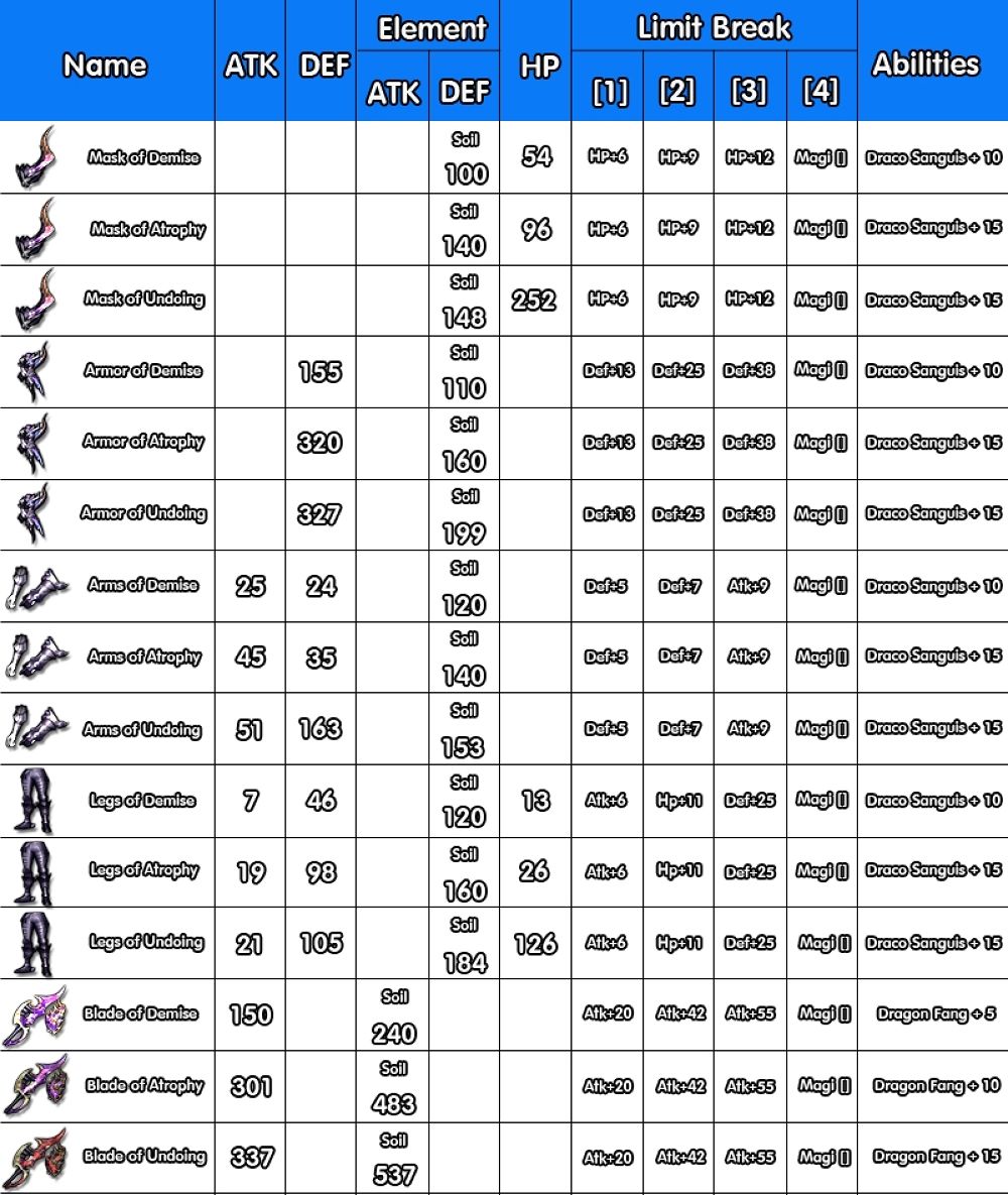 สำหรับชุดนี้จะป้องกันธาตุดินและโจมตีธาตุดิน โดยสเตตัสของชุดที่ได้จากการ Limit Break นั้น
