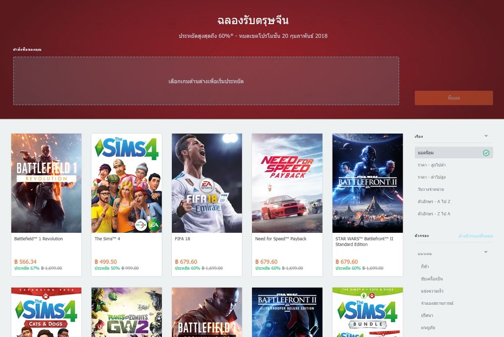 Battlefield 1: Revolution ราคาถูกสุดอยู่ที่ 566 บาท, Battlefield 1: Premium Pass ลดราคาเหลืออยู่ที่ 489 บาท, FIFA 18, Need for Speed Payback หรือ Star Wars: Battlefront 2 ราคาถูกสุดอยู่ที่ 679 บาท