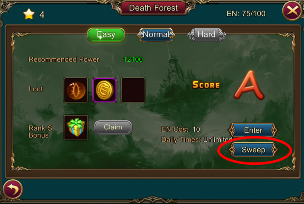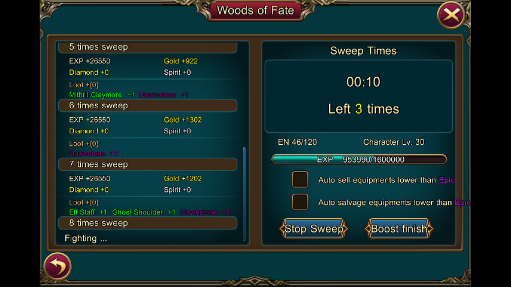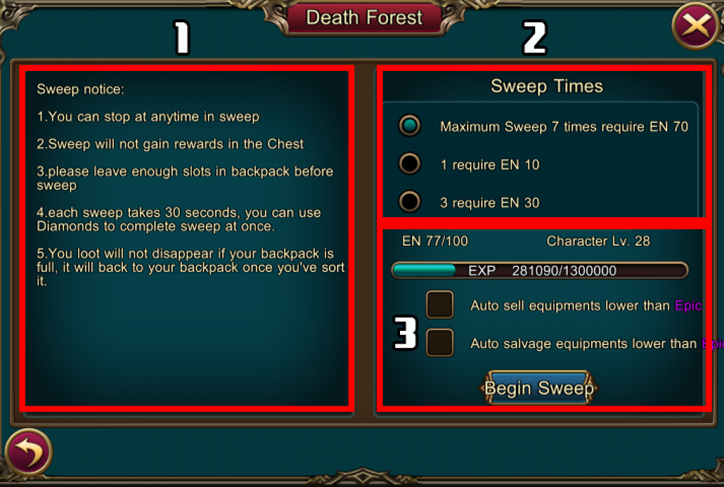 บางครั้งเราไม่ค่อยมีเวลาแต่ครั้นจะไม่เล่นเกมก็กลัวเสียดาย Energy โดยเปล่าประโยชน์วันนี้กบมีผู้ช่วยเจ๋งๆมาแนะนำนั่นคือระบบ Sweep Time นั่นเอง โดยเจ้า Sweep เนี่ยจะเปรียบเสมือนเราไปลงดัน แต่เราไม่ต้องลงเองโดย การ Sweep แต่ละครั้งจะเหมือนเราลงดัน 1 รอบ แต่จะไวกว่าโดยใช้เวลาเพียง 30 วินาทีเท่านั้น!! แต่ก็นั่นแหล่ะครับความสะดวกก็ต้องแลกมาด้วยอะไรเล็กน้อยนั่นคือเราจะไม่ได้ไอเทมจากหีบสมบัติภายในด่านนั่นเอง และหากของเราเต็มล่ะก็จะเก็บไอเทมใหม่ๆไม่ได้ แต่เราก็สามารถตั้งค่าให้ขายไอเทมอัตโนมัติหรือย่อยได้ครับ ^o^
