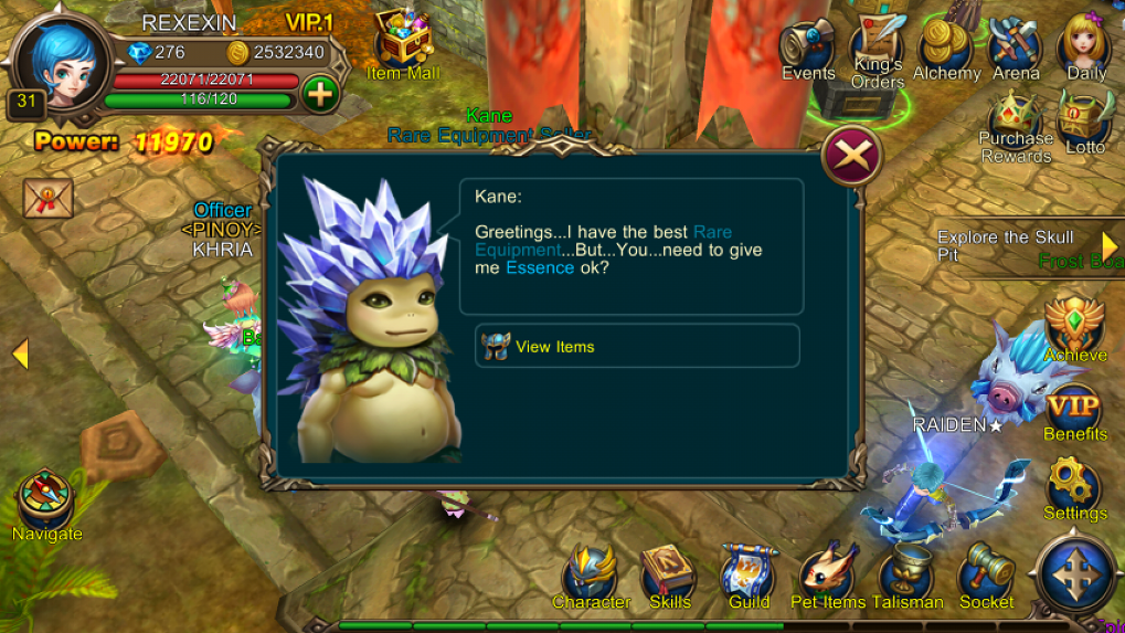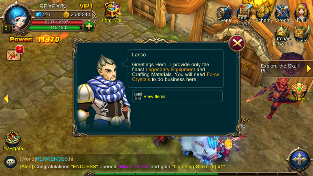 NPC ที่จะขายอาวุธ Legendary และอัพเกรดอาวุธให้กับโดยจะต้องใช้ Force Crystal มาทำการแลกโดยวิธีที่หาได้ง่ายที่สุดคือจากร้านค้าใน Arena นอกจากนี้ NPC ตัวนี้ยังสามารถตีบวกไอเทมให้เราได้อีกด้วย