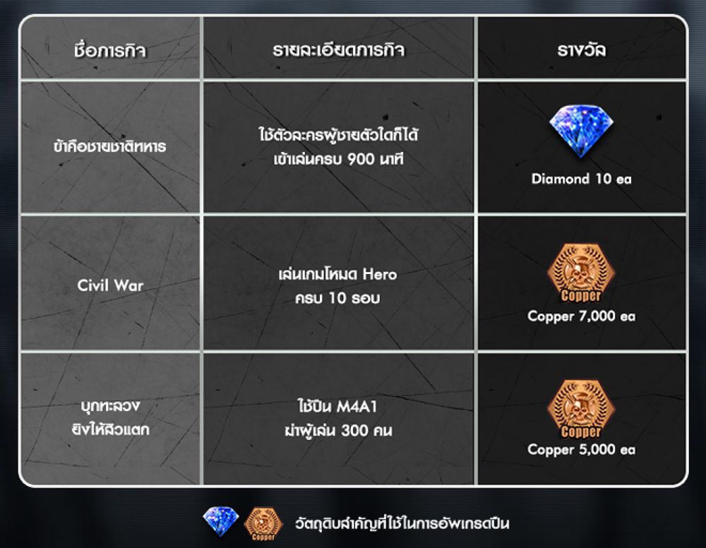 ใครที่หาวัตุดิบเพื่อใช้อัพเกรดปืนมาทางนี้เลยกับการทำ Quest ประจำสัปดาห์ในช่วง CBT หากทำสำเร็จได้ตามที่กำหนดรับของรางวัล Daimond และ Copper วัตถุดิบสำคัญที่ใช้ในการอัพเกรดปืนไปเลย!(ของรางวัลจะถูกส่งไปยัง Inventory ภายในเกมโดยอัตโนมัติเมื่อทำภารกิจสำเร็จ)