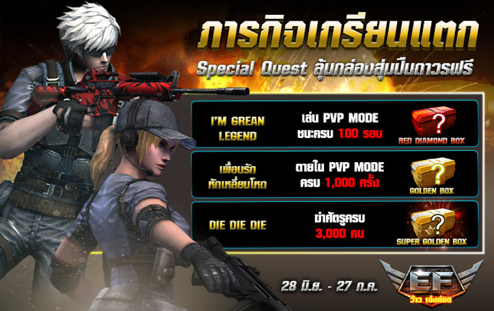 ต้อนรับการกลับมาของยอดเกมแนว FPS สุดเดือดแห่งปี 2017 กับ EF ว้าวเจ๋งค่อด เตรียมเปิด CBT พร้อมกันทั่วประเทศ 28 มิถุนายนนี้ พร้อมด้วยภารกิจ และ กิจกรรมสุดมันส์พร้อมไอเทมฟรีมากมายให้ได้ลองเล่นกันในช่วง CBT แบบจุใจไม่มีกั๊ก โดยจะมีภารกิจอะไรบ้างนั้นตามมาดูกันเลย