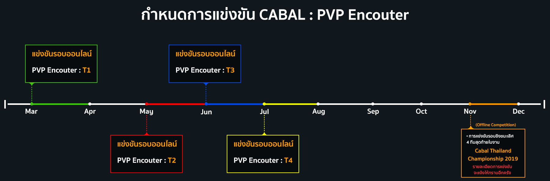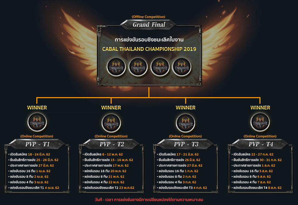- การแข่งขันรอบ 4 ทีมสุดท้าย (Offline Competition) ในงาน Cabal Thailand Championship 2019 สำหรับรายละเอียดการแข่งขันจะแจ้งให้ทราบอีกครั้ง