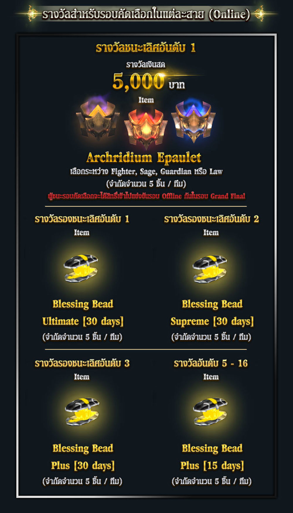 - ผู้ชนะในรอบคัดเลือกของแต่ละรายการ จะได้รับสิทธิ์เข้าแข่งขันรอบชิงชนะเลิศ Grand Final 4 ทีมสุดท้าย (Offline Competition)