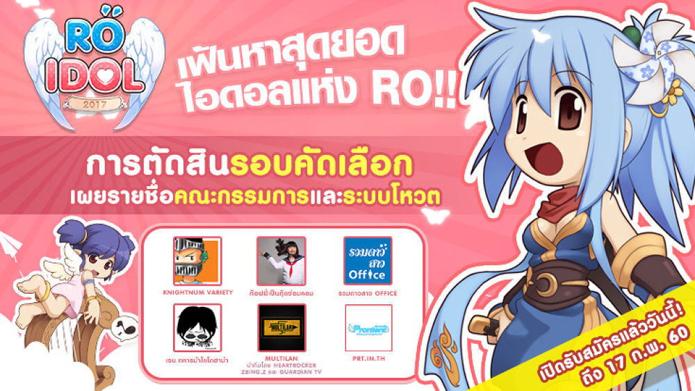 RO IDOL เวทีเฟ้นหาสุดยอดไอดอลแห่งเกม Ragnarok ได้เริ่มต้นขึ้นแล้ว ซึ่งเปิดรับสมัครตั้งแต่วันนี้ ไปจนถึงวันที่ 17 ก.พ. 60 แบบไม่จำกัดเพศ เพื่อชิงรางวัลรวมมูลค่ากว่า 500,000 บาท โดยผลการตัดสินจะมาจากการคัดเลือกของคณะกรรม และผลโหวตของผู้เล่นเกม RO ทุกท่าน สำหรับการค้นหาไอดอลแห่งเกม RO ให้เหลือเพียง 10 คนสุดท้ายก่อนจะไปขึ้นเวทีประกวดสุดอลังการ ที่งาน Extreme Games 2017 ในวันเสาร์ที่ 11 มีนาคม 2560 ณ ศูนย์การค้าแฟชั่นไอส์แลนด์