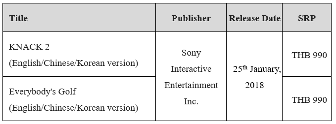ประกาศวางจำหน่ายเกมใหม่รุ่น Greatest Hits ของ PlayStation4 ในวันที่ 25 มกราคม ศกนี้ โดยสามารถหาซื้อได้ที่ตัวแทนจำหน่ายของ PlayStation ทุกสาขาในราคา 990 บาท ประกอบไปด้วยเกม