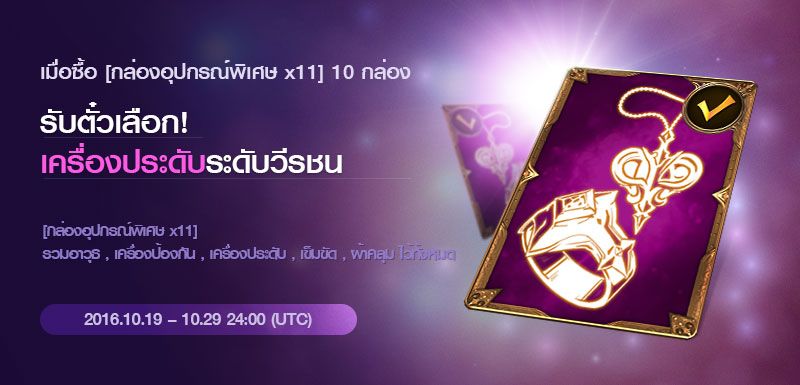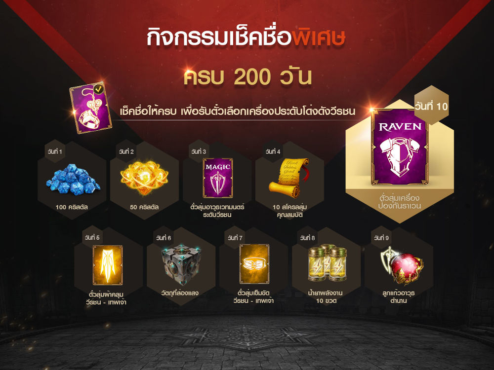 ผู้เล่นที่ล็อกอินในช่วงกิจกรรมนี้(ตั้งแต่วันที่ 20 ต.ค. ถึง 10 พ.ย. 2559) จะได้รับของรางวัลมากมาย ได้แก่ คริสตัล, เฮเว่นสโตน, อาวุธเวทย์มนตร์ระดับวีรชน และตั๋วสุ่มเครื่องป้องกันราเวน เป็นต้น